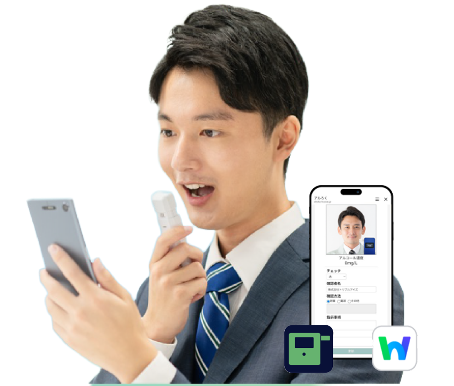 導入済みのアルコール検知器、LINE WORKS、スマホがあればアルろくを始めることができます