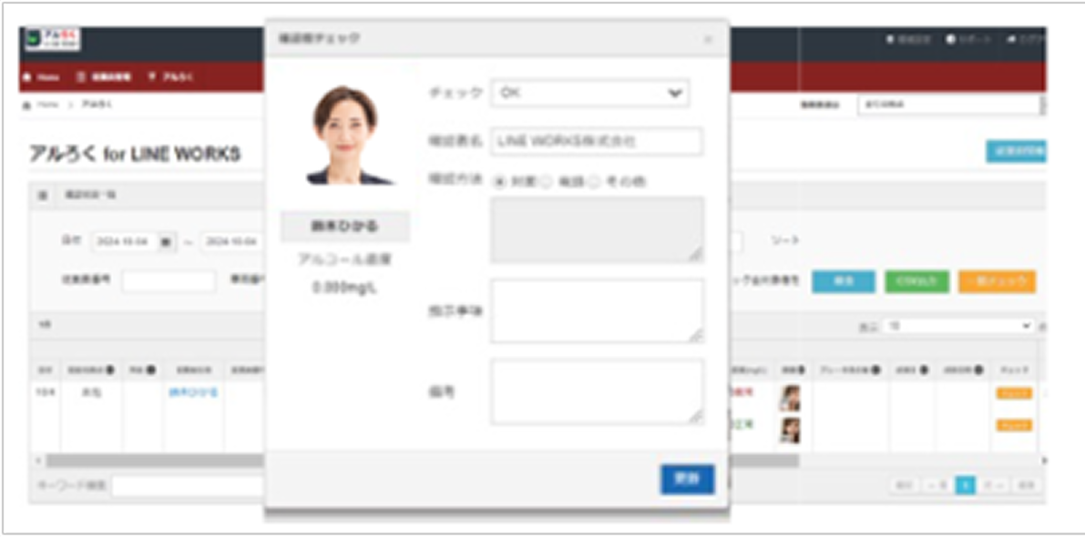 「アルろく for LINE WORKS」はAI顔認証機能を搭載したクラウド型のアルコールチェックサービスで、ドライバーや管理者の業務負担を軽減できます。
